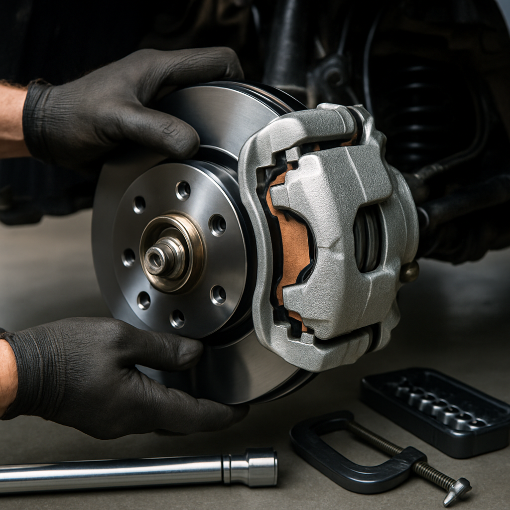Fjern kaliberbeslaget – dette kræver normalt to større bolte. Træk den gamle bremseskive af navet. Hvis den sidder fast, brug gummihammer til forsigtig banken. Rengør navfladen grundigt med ståbørste og fjern rust og snavs. Dette sikrer at den nye skive sidder plan. Montér den nye bremseskive og sikr den med en hjulmøtrik midlertidigt. Genmonter kaliberbeslaget med momentnøgle til producentens specifikationer – typisk 80-120 Nm.